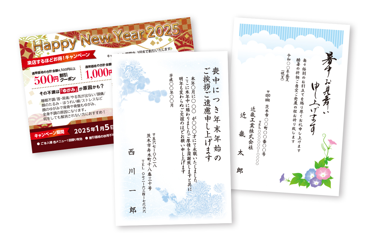 暑中見舞いや寒中見舞いなどの季節のはがきから、セールの案内や新商品のお知らせDMなど 印刷から封入・封緘作業までおまかせください。